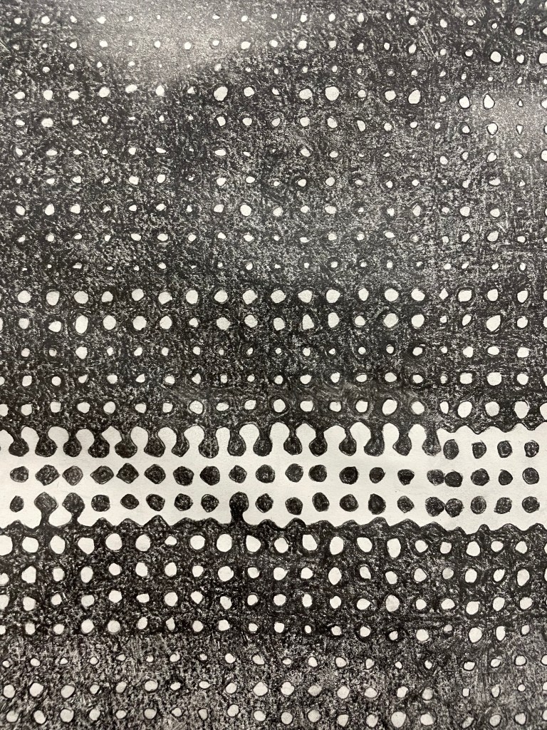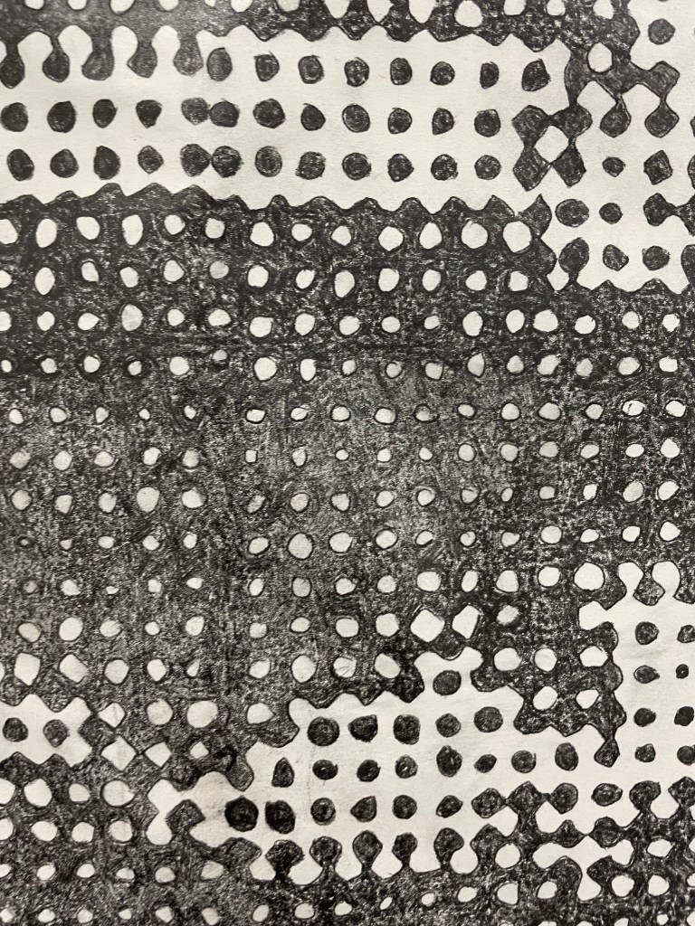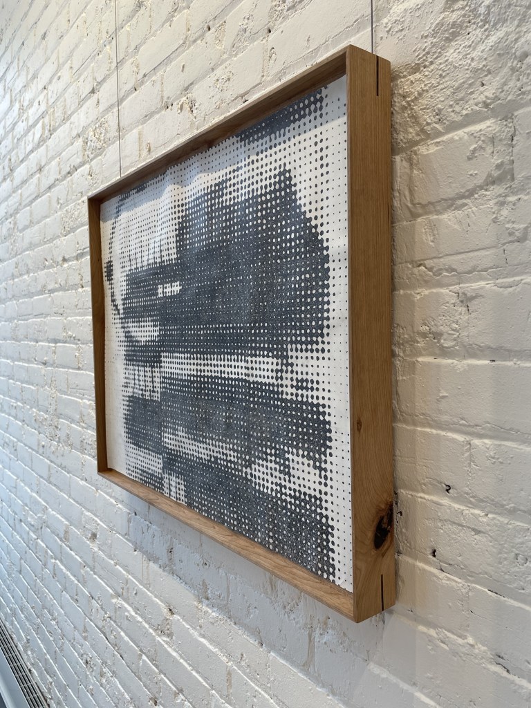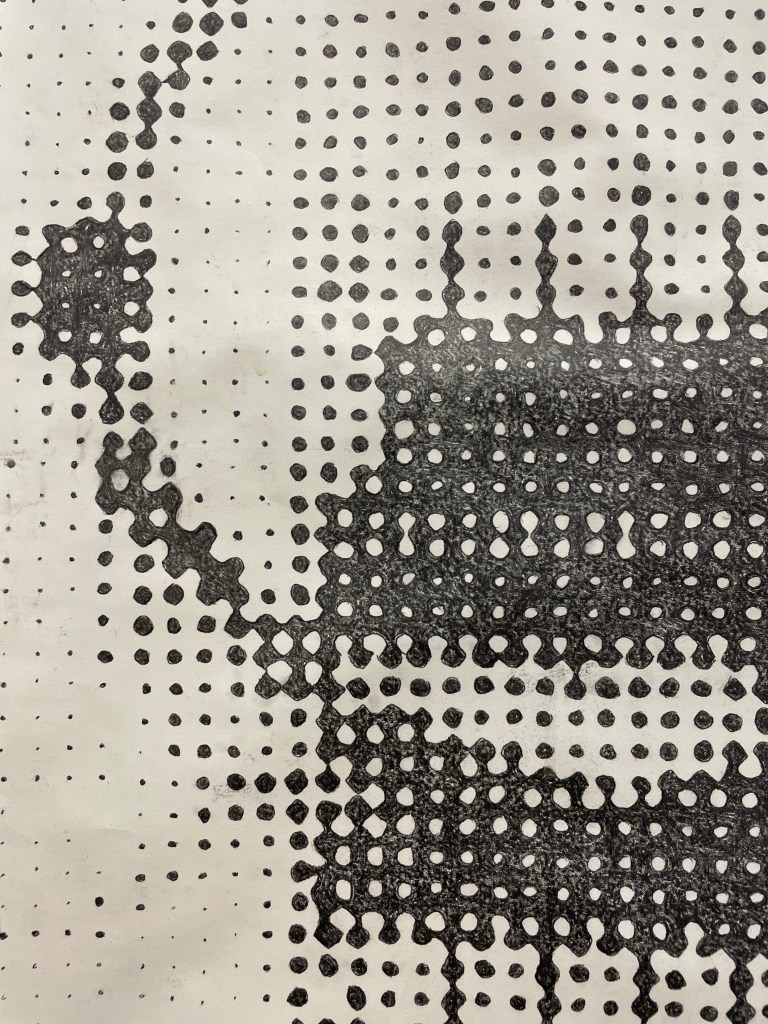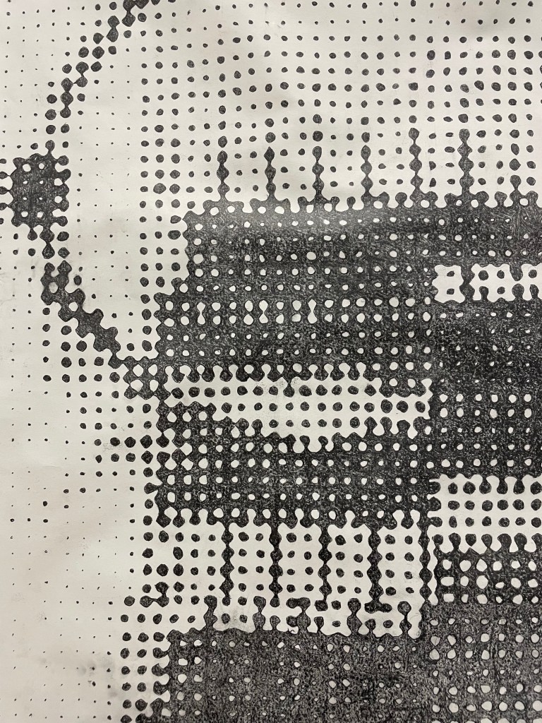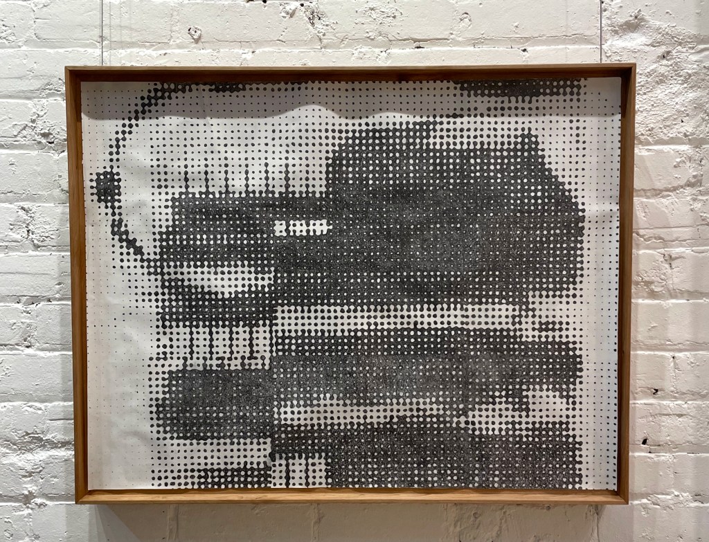 CIM system explores the tension between automatized industrial repetition and manual ritualized repetition. An image of a CIM system circuit (industrial automation circuit) is painstakingly reproduced by hand in a halftone pattern. At a distance, the image reads almost like a digital image, but up close the rough hand drawn lines, smudges and worn paper become visible. In the artist’s ultimate inevitable failure to perfectly reproduce a digital image by hand, the manual bleeds into the robotic, disrupting and degrading the image with the human essence. The use of a larger scale halftone places the image in an uncomfortable zone, neither legible or illegible, and gestures towards the history of automated image reproduction and distribution. I am interested in questioning the relationship between the handmade and tactile and the mass produced, both in regards to objects and in regards to image production, reproduction and distribution.