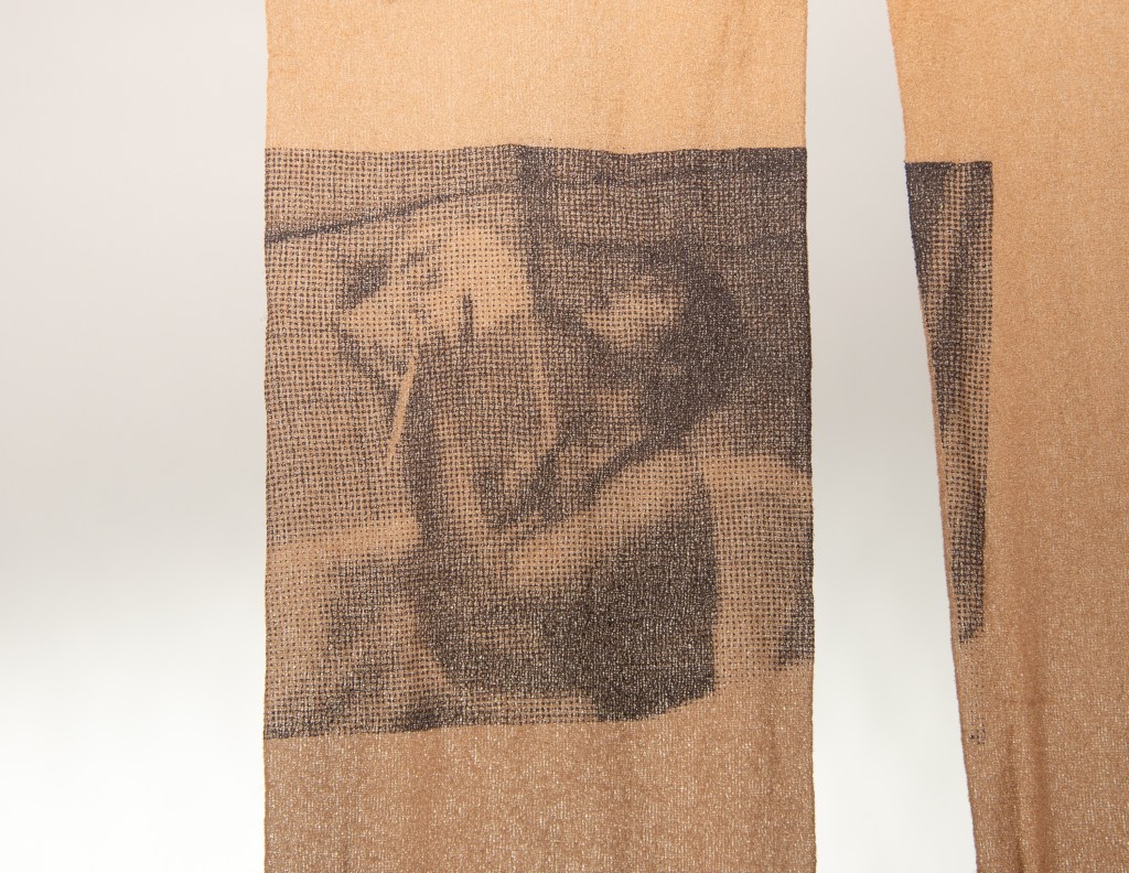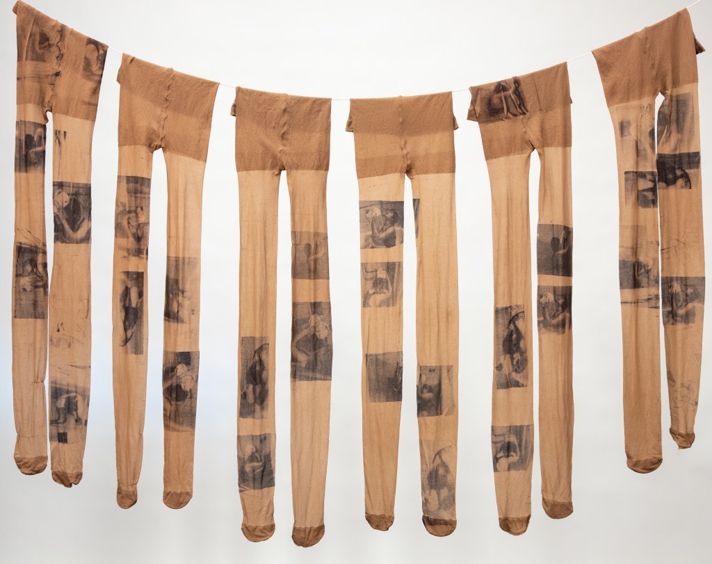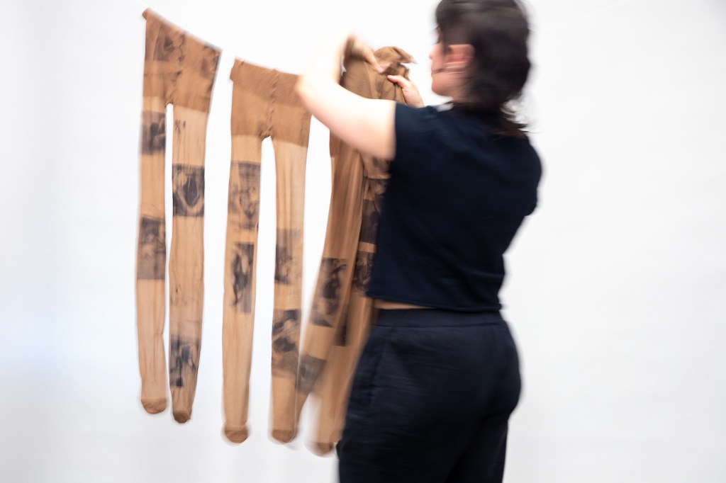“Muddy Stockings” explores themes of sensuality and shame through repeated screen prints of the artist pouring water over themself in a bathtub. Hung up to mimic stockings hanging to dry on a clothesline, the prints resemble dirty stains, that upon a closer look reveal themselves to be repeated screen prints of the artist pouring water over themself in a bathtub. The images reference rituals of cleansing and purifying as well as the intimate and often sensual act of bathing oneself, a private moment during which one develops a complicated relationship to their body. The stockings speak to the intimate and the bodily, as undergarments are meant to hide and obscure. The viewer takes on a voyeuristic presence, witnessing the artist’s shame and desire as it is on display for the world to see, no longer concealed.
